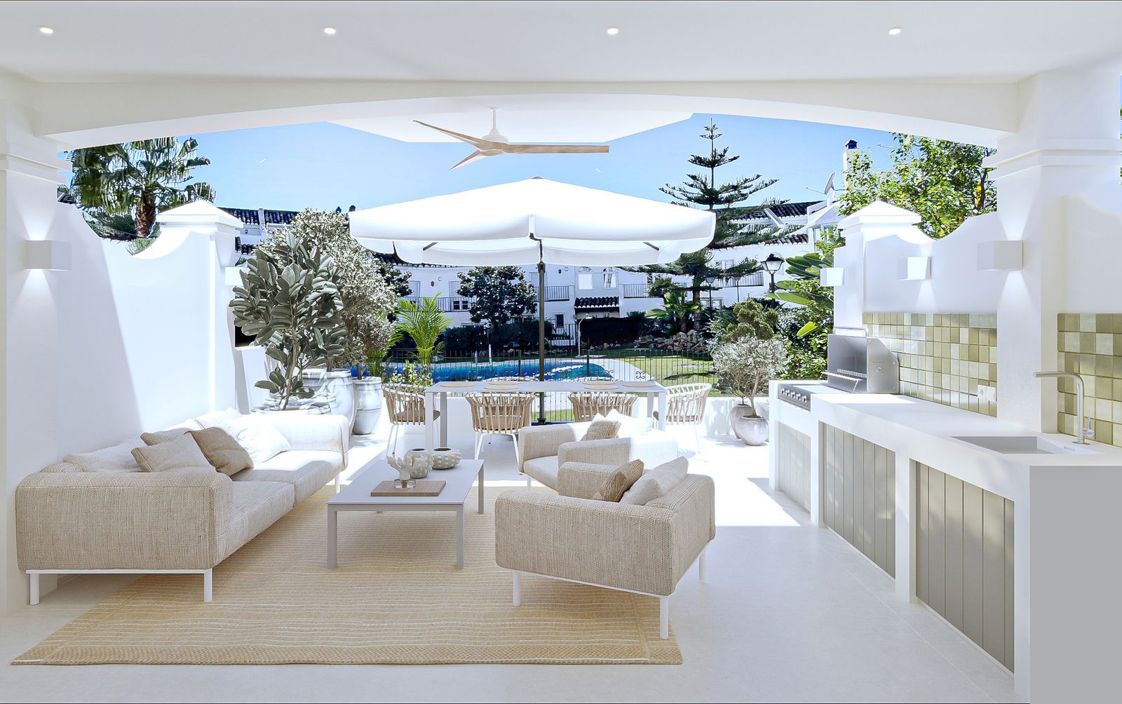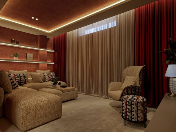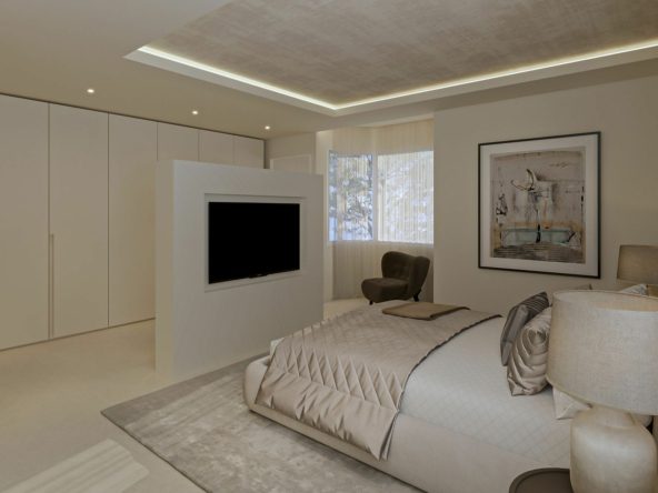 The home has been completely refurbished to an uncompromising standard, featuring a bespoke open-plan Santos kitchen, a custom outdoor kitchen and a dedicated wine cellar. The interiors are fully furnished with custom-made furniture throughout, including lacquered fitted wardrobes with integrated LED lighting, as well as beds with built-in storage and premium 35 cm mattresses with toppers.