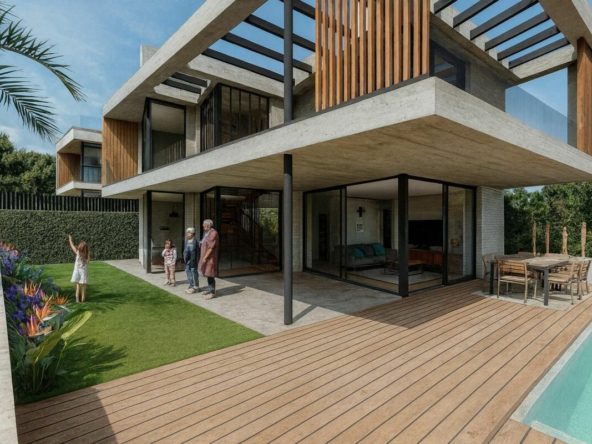 The exterior is designed for relaxation and entertainment, boasting a private swimming pool, sunbathing areas, and a fully equipped BBQ zone perfect for gatherings.