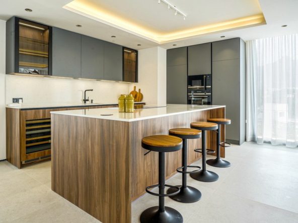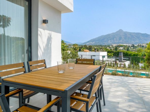 This absolutely beautiful villa has just been completely reformed in a modern contemporary style and is situated in Nueva Andalucia, just a short walk from services and restaurants, including a supermarket. The large commercial centre of Central Plazas is just a 10 minute walk away. The villa is in a no-through road, guaranteeing a peaceful and private location, free of traffic. The villa itself is very impressive and the materials used in the refurbishment are top quality. Upon entering on the villa we find a spacious open plan configuration, with large windows that allow plenty of natural light into the property. This area incorporates the kitchen, with island and completely fitted out with quality appliances including a wine fridge, the dining area and the living area with fireplace . There is also a breakfast area and several terraces to enjoy the ambient climate. The laundry room and storage are in a separate area. On the upper level we find three bedrooms, all with modern ensuite bathrooms and two of the bedrooms have a nice terrace. On the lower level of the property, we find two more bedrooms, two bathrooms, a TV / Cinema room and a games room with pool table / table tennis table. There is also an office on this level. Several features have been incorporated into the design such as a Demotic system that controls the lighting, heating, cooling, electric blinds and the security. Everything can be controlled via a mobile smartphone. The villa has good security with CCTV cameras both inside and outside the villa and these cameras can also be accessed from a smartphone. The landscaped gardens offer beautiful and open views of La Concha mountain and the villa also offers total privacy. Everything comes with a year guarantee, giving the new owner absolute confidence in this beautiful new home.