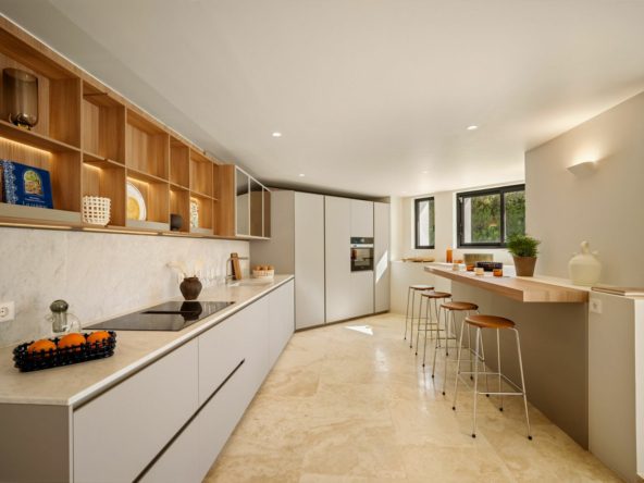 At the heart of the home is a stunning open-plan kitchen designed by Ernesto Meda, paired with Miele appliances and Italian Fantini Rubinetti taps, creating a gourmet space where precision meets beauty. The seamless integration of the kitchen with the dining and living areas offers an effortless flow, opening directly to the landscaped terrace and pool. Every detail has been carefully considered—from seamless architectural door systems that disappear into the design, to built-in wardrobe systems with Italian modular flexibility that combine elegance with smart storage solutions. Even the over 100-year tradition of Italian-made handles enriches the interiors with ergonomic precision and visual clarity.