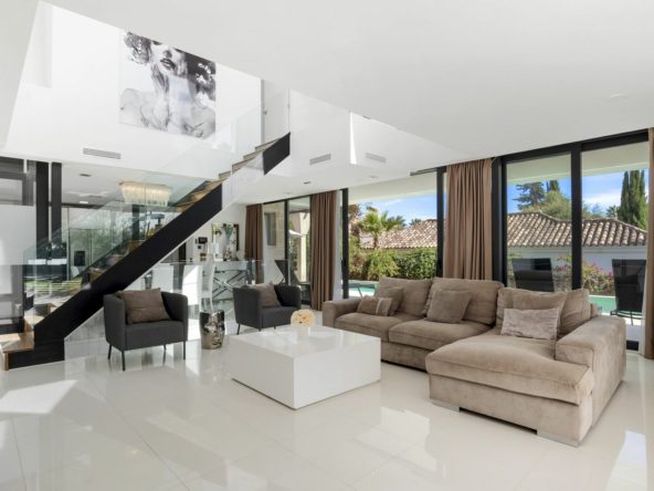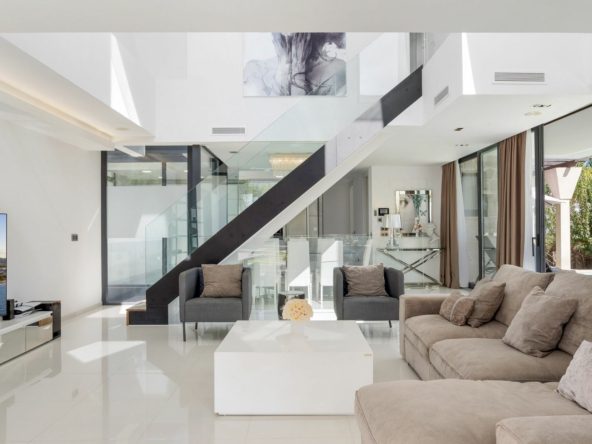 Nestled in the prestigious enclave of La Cerquilla, Villa La Cerquilla is a sanctuary of contemporary luxury surrounded by the beauty of Marbella’s Golf Valley. Behind its private gates, the residence opens onto five generous double bedrooms, including a refined master suite with its own bathroom. For greater versatility, a separate guest or staff apartment and a dedicated service room provide comfort and privacy for every lifestyle.