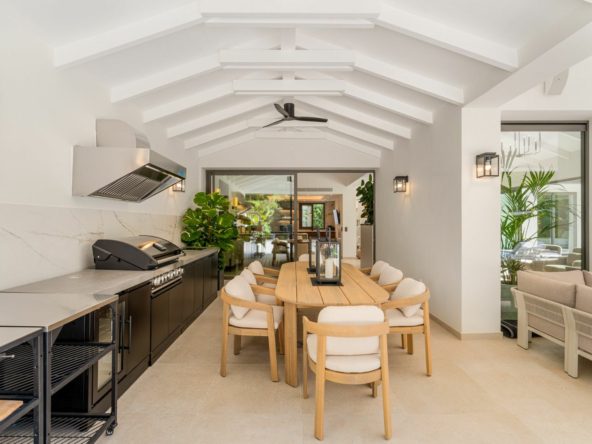 Outdoors, the villa continues to impress. Beautifully landscaped gardens surround a private swimming pool, pre-installed for heating, allowing year-round enjoyment. The terraces feature a dedicated outdoor kitchen, dining space, and chill-out zones ideal for alfresco living. The villa offers total privacy and spaciousness while maintaining a close relationship with the natural surroundings, creating a true oasis within one of Nueva Andalucía’s most exclusive communities.