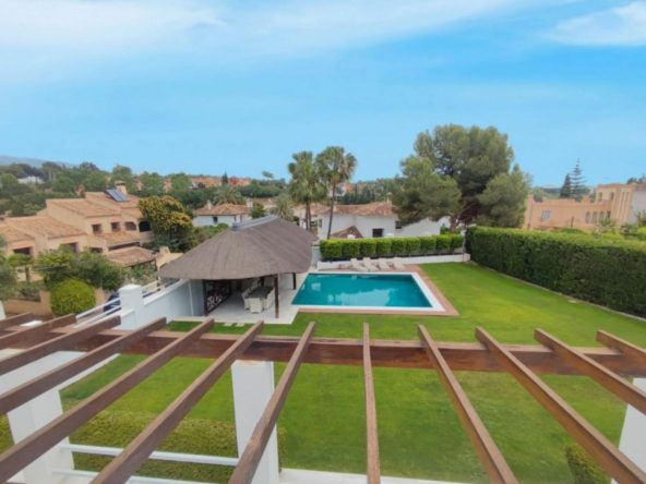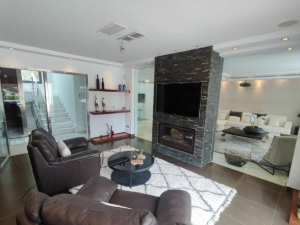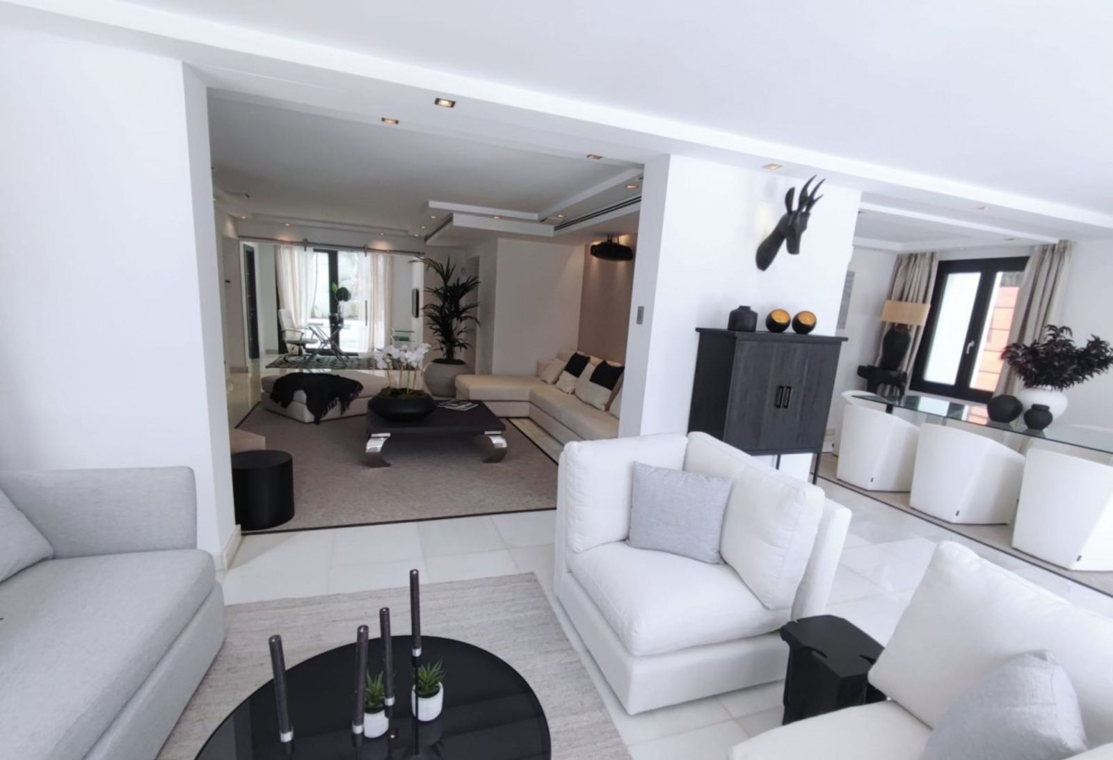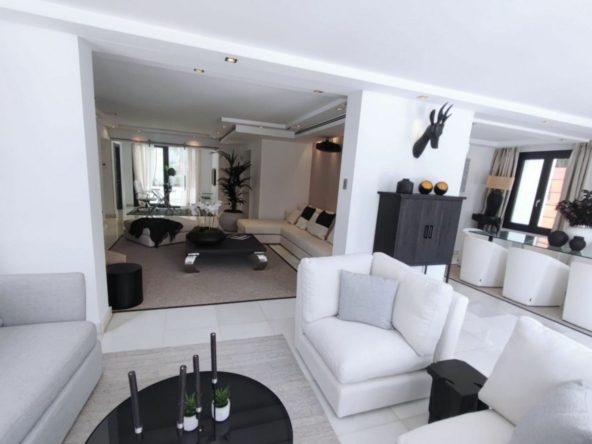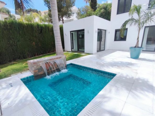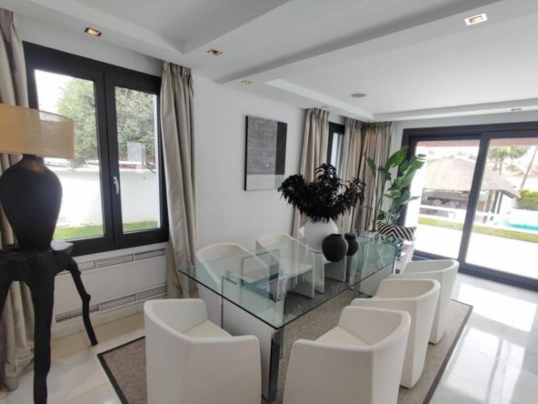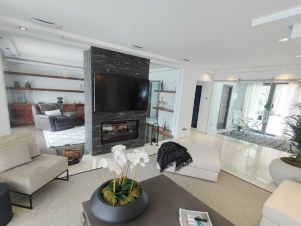 A stunning contemporary five-bedroom villa recently renovated, located just a few minutes’ walk from Central Plaza and Puerto Banús. The entrance and gardens feature a serene Japanese-style water feature, leading into an open-plan foyer with a spacious reception area thoughtfully divided into a TV lounge, dining space, and a double-sided fireplace, with a private office behind a glass partition. The newly renovated kitchen is fully equipped with all modern appliances.