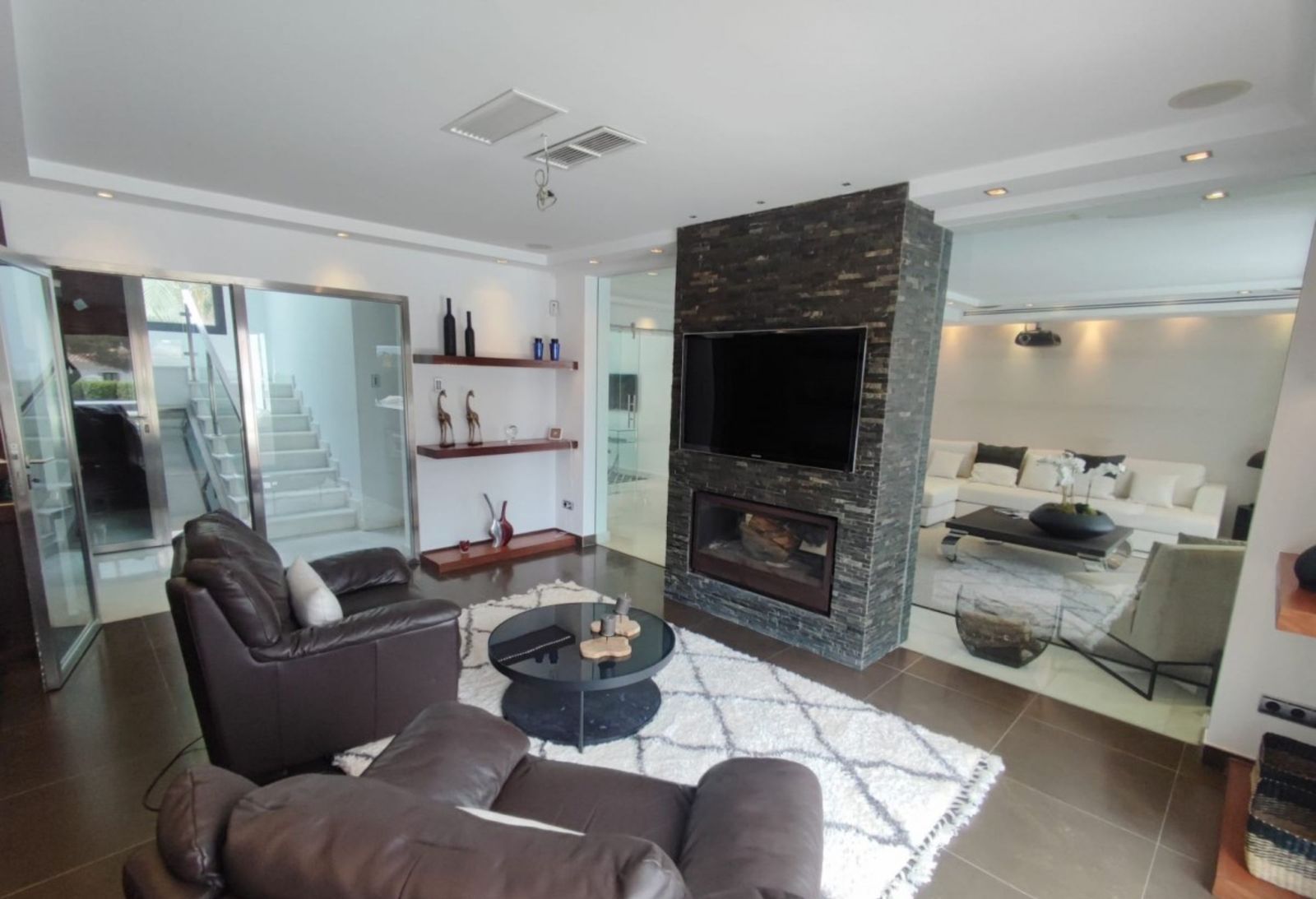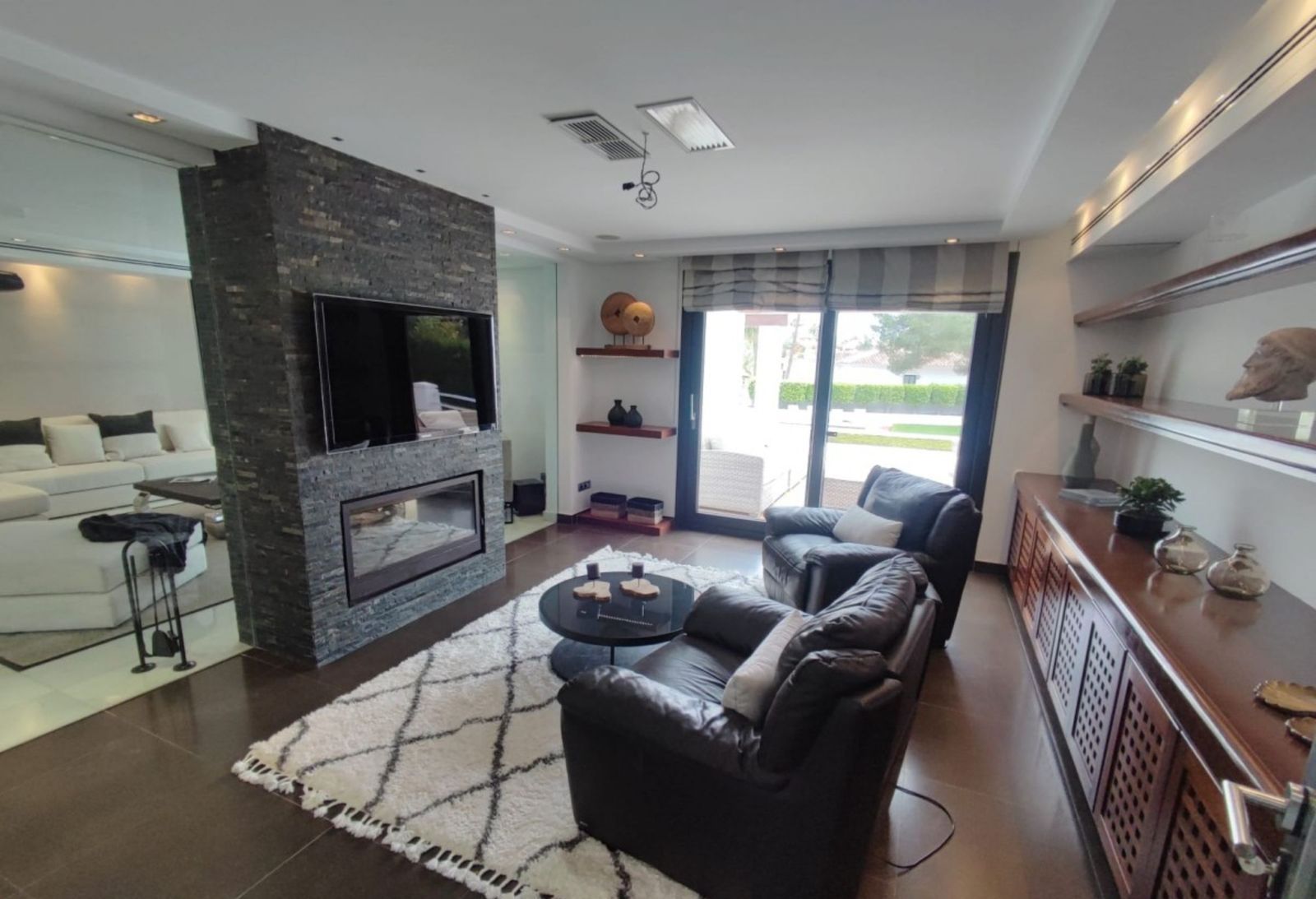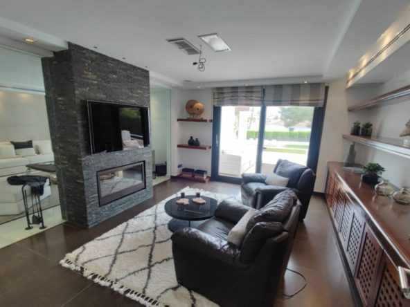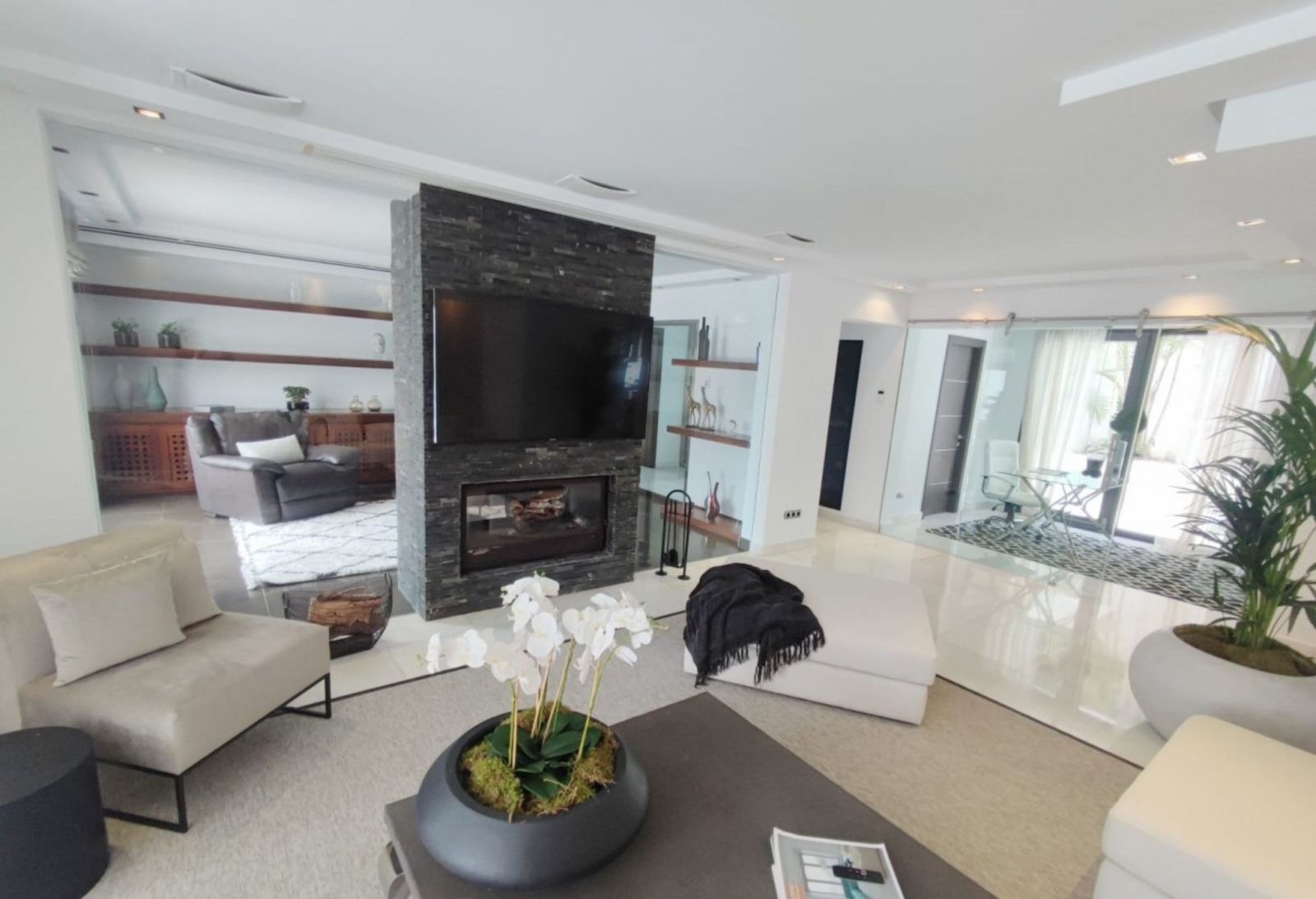 A stunning contemporary five-bedroom villa recently renovated, located just a few minutes’ walk from Central Plaza and Puerto Banús. The entrance and gardens feature a serene Japanese-style water feature, leading into an open-plan foyer with a spacious reception area thoughtfully divided into a TV lounge, dining space, and a double-sided fireplace, with a private office behind a glass partition. The newly renovated kitchen is fully equipped with all modern appliances.
