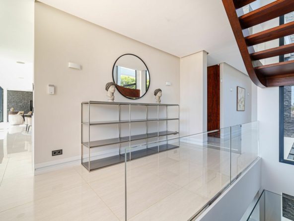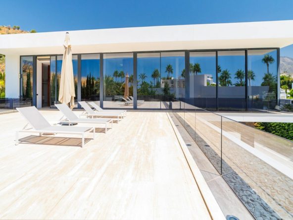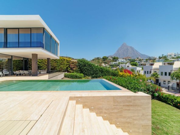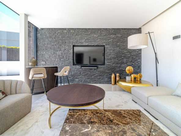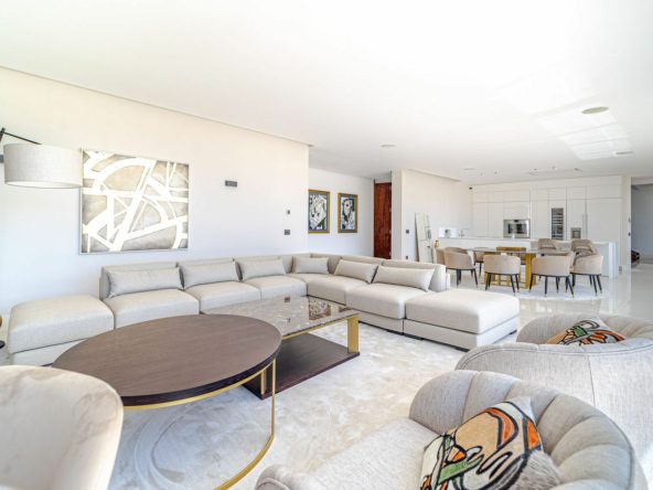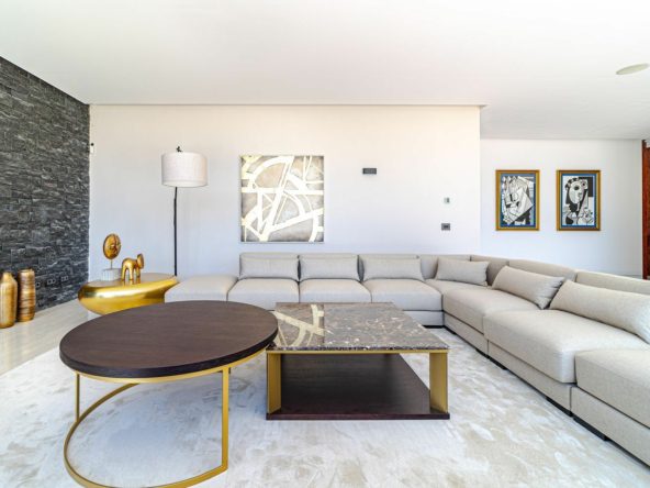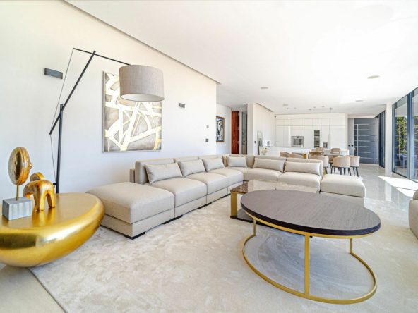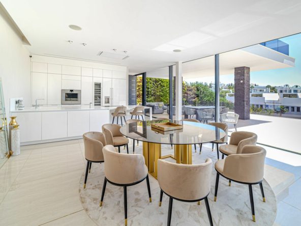 As you enter the villa, you'll step into a nice kitchen with a central island and modern Gaggenau appliances. Moving ahead, there's a big living area that joins a large dining table for 10 people and two cozy lounge spots.