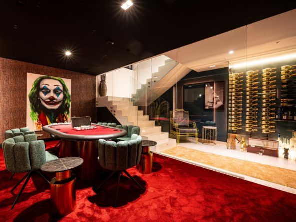 The villa has two guest bedrooms on the main floor, each with en-suite bathrooms and garden views. Upstairs, the master suite offers dual dressing rooms, a private office, and a large bathroom with a free-standing bathtub. The suite opens to a terrace with sweeping views. Another en-suite bedroom completes the upper floor. The basement level includes a private gym, cinema, wine cellar, and entertainment spaces, giving you everything you need for both relaxation and leisure.