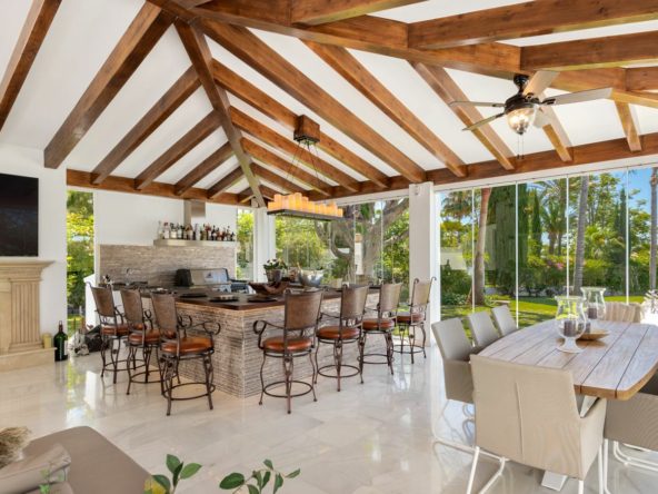 Outside, the villa boasts a large swimming pool with an elevated section and waterfall feature, surrounded by manicured lawns and mature trees for privacy. Multiple seating and dining areas, including a tiled courtyard with a decorative fountain, invite year-round enjoyment of Marbella’s climate. Expansive glass walls and terraces create an easy indoor-outdoor flow. Notably, the property offers one of the rare direct entrances to Los Naranjos Golf, with thoughtfully designed pathways wide enough for a golf buggy.