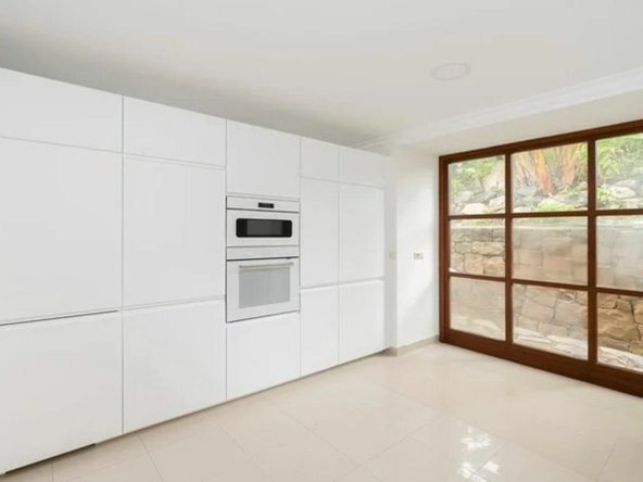The exterior is a true oasis: a well-maintained garden surrounded by palm trees and tropical plants, complemented by a barbecue area with a wood-fired oven, perfect for outdoor gatherings. The terraces and open spaces provide ideal spots for relaxing, dining, or enjoying the panoramic views of La Concha mountain.