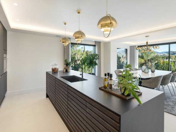 The kitchen is hand-made to emphasise the space and opportunity that this villa presents. With the food preparation areas at the entrance overlooking the large dining area, this is the perfect design because of the immense window that frames the view to las Brisas Golf and magnificently to la Concha.