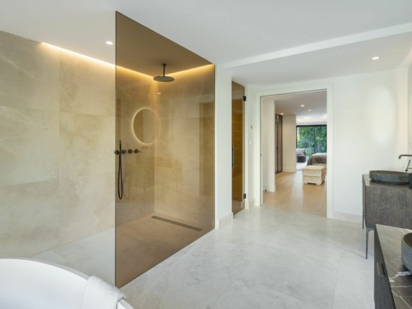 A generous driveway leads from the road outside and allows for cars to access the secure garage with space for 2 cars. From here the quality and consideration that has gone into this fabulous luxury Marbella home is evident, with the floors seemlessly flowing from here into the villa and to the exterior terraces by use of exquisite 120cm x 120cm Italian ceramic tiles.