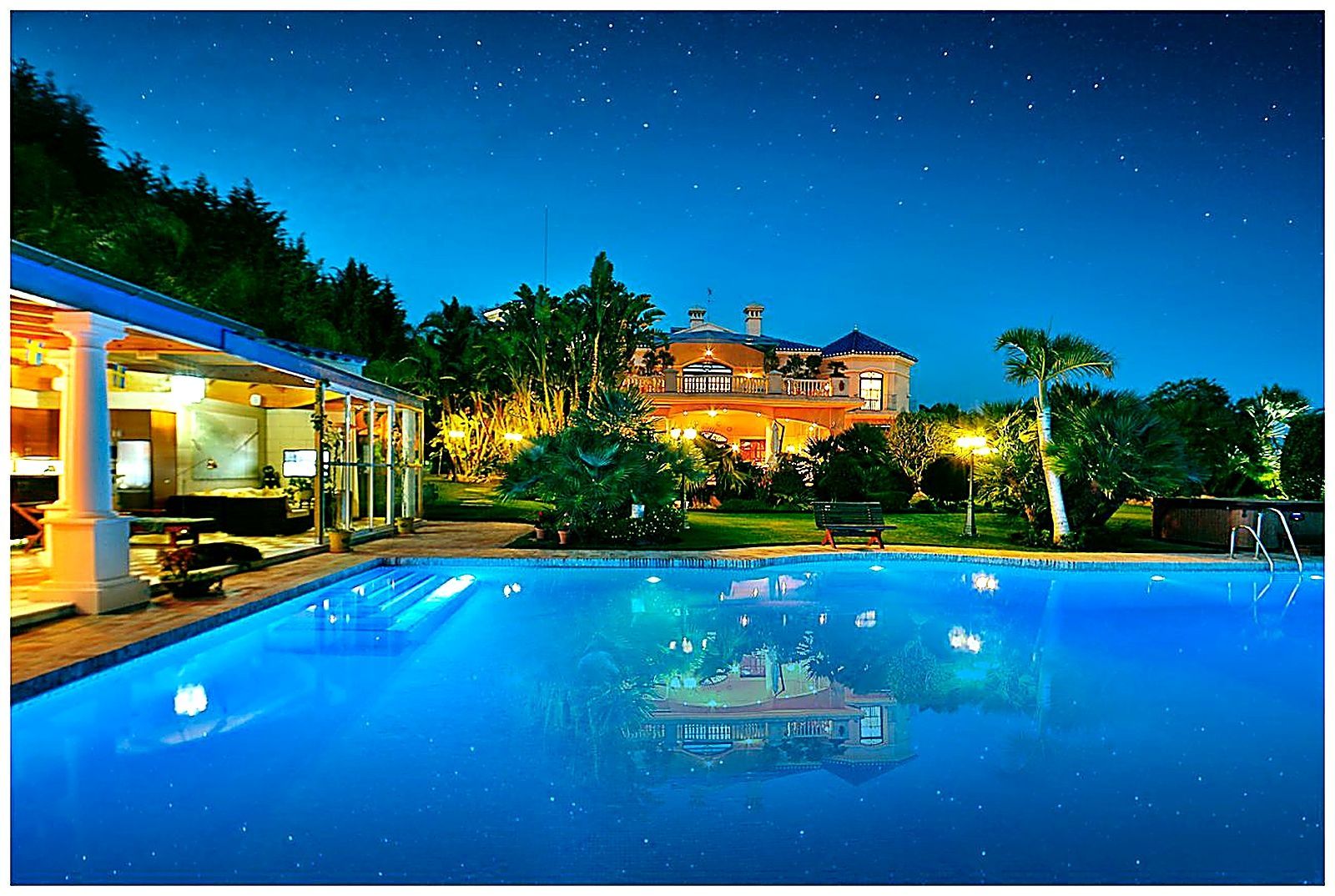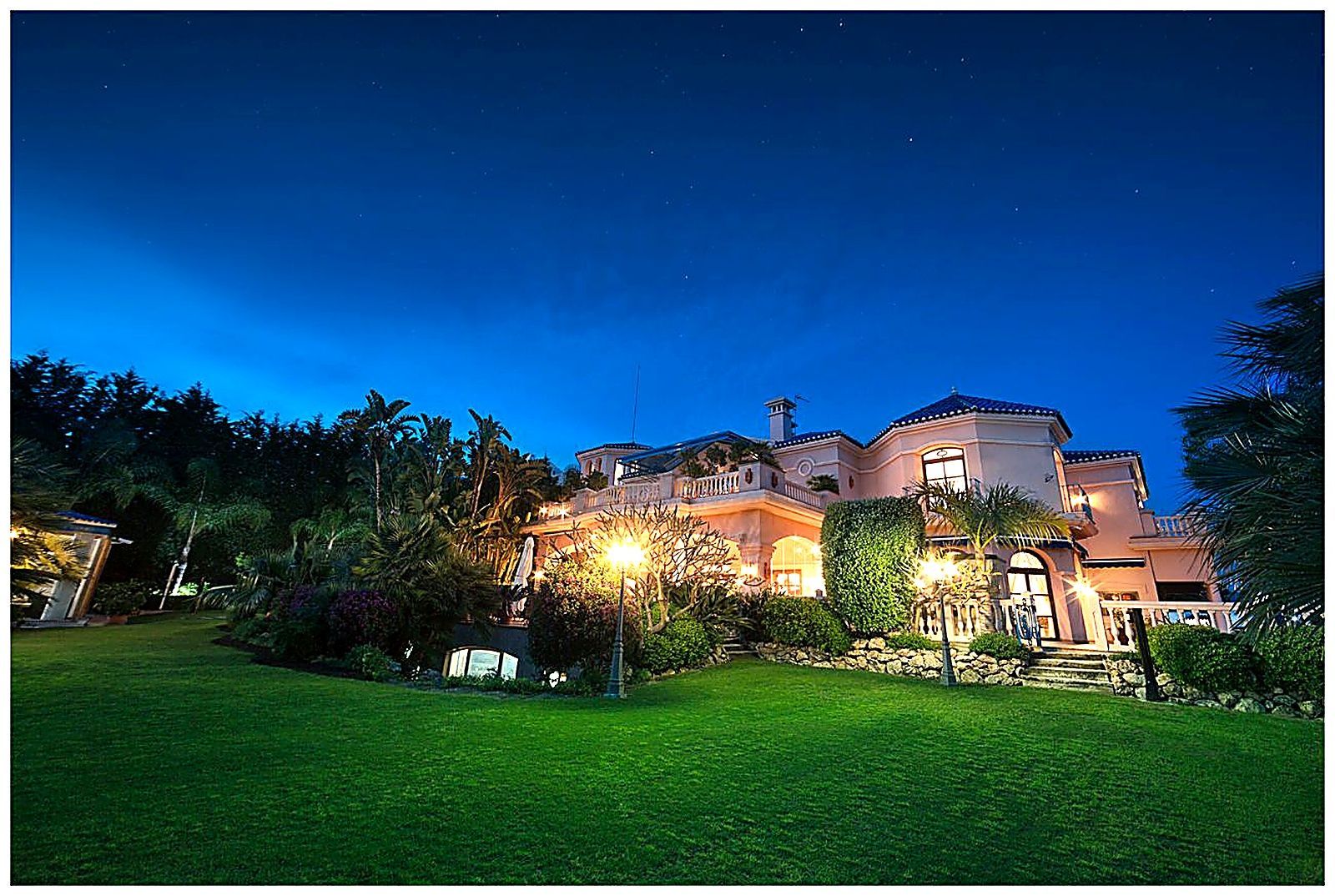 The landscaped garden is carefully designed with lush lawns, fruit trees, and flowerbeds, beautifully illuminated at night.