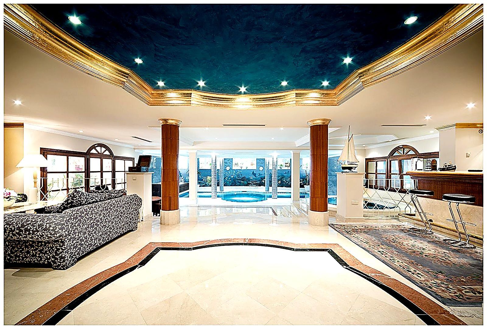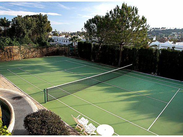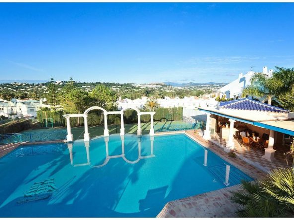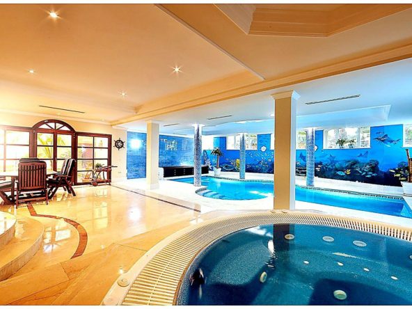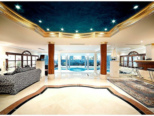 The house welcomes its guests with two magnificent stone lions at the entrance, evoking the feeling of a royal estate. A stunningly beautiful, exciting, and exceptionally well-built home, offering breathtaking panoramic views of the golf course and distant mountains. Featuring exclusive materials and a thoughtfully designed bright and elegant interior. A soaring 10-meter ceiling rising to the tower room creates a majestic sense of space. Wine cellar, private cinema, gym, private tennis court, and an impressive billiard table… plus both indoor and outdoor kitchens.