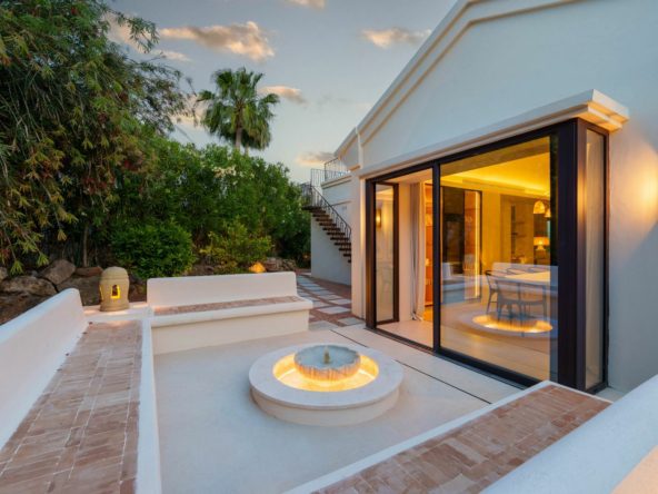 Beautifully reimagined single-level villa nestled in the heart of Nueva Andalucía, just minutes from the prestigious Los Naranjos Golf Course. Designed and developed by Casas Fintech, this exquisite four bedroom residence blends Mediterranean elegance with modern comfort and design. Positioned on a lush, elevated plot, it offers a private, tranquil setting with breathtaking views stretching across the valley to the sea, all within easy reach of Marbella’s finest golf, dining, and beach destinations. Step inside to discover a soothing palette of natural tones, soaring vaulted ceilings, and an open-plan layout that seamlessly connects the living area with a sleek, modern kitchen and dining space. Every detail has been thoughtfully considered—from the high-spec appliances and custom furnishings to the ambient lighting and refined finishes. Expansive floor-to-ceiling glass doors flood the interiors with natural light and open onto a spacious terrace featuring a sunken lounge, outdoor kitchen, and a dramatic infinity-edge pool that appears to float above the landscape. The exterior spaces are equally impressive, with manicured gardens and multiple alfresco living areas ideal for entertaining or relaxing in complete privacy. A rooftop terrace provides panoramic views, while a tranquil courtyard with a water feature offers a peaceful escape. Inside, four generous bedrooms—including a serene master suite with direct garden access—are complemented by luxurious amenities throughout, creating a perfect balance of sophisticated living and laid-back coastal charm in one of Marbella’s most coveted neighbourhoods.