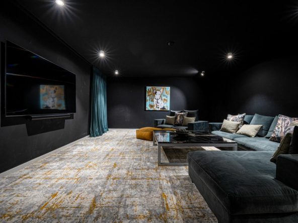 The villa has two guest bedrooms on the main floor, each with en-suite bathrooms and garden views. Upstairs, the master suite offers dual dressing rooms, a private office, and a large bathroom with a free-standing bathtub. The suite opens to a terrace with sweeping views. Another en-suite bedroom completes the upper floor. The basement level includes a private gym, cinema, wine cellar, and entertainment spaces, giving you everything you need for both relaxation and leisure.