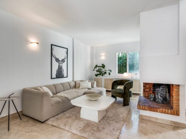 On the ground floor, you will find a fully renovated open-plan kitchen, spacious and modern, seamlessly connected to the living–dining area. From here, you can access a large rear terrace, perfect for outdoor dining, as well as a guest toilet. At the front of the house, there is a peaceful patio furnished with outdoor sofas—an ideal spot to relax.