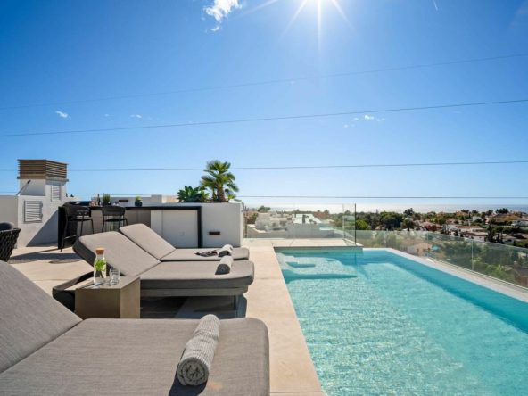 Designed to blur the boundaries between indoor and outdoor living, the residence features an expansive covered terrace ideal for dining and entertaining with family and friends. The bespoke rooftop solarium, complete with a private pool and breathtaking panoramic views over the Mediterranean Sea, Gibraltar, Africa, and Marbella’s iconic La Concha mountain.