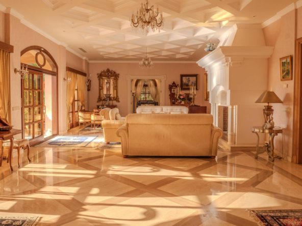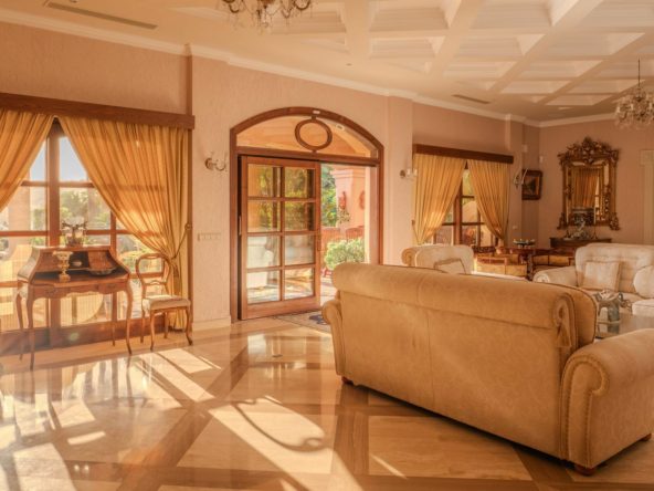 Gracefully positioned in Aloha, Nueva Andalucía- one of Marbella’s most coveted addresses, this west-facing landmark residence sits on a 3,400 m² plot and captivates with its grand, refined appearance. Its 1,727 m² of interiors showcase soaring double-height ceilings, intricate woodwork, and hand-finished marble, creating spaces of enduring beauty and sophisticated character.
