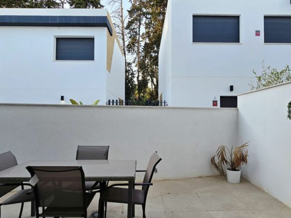 The townhouse comprises 3 bedrooms, 2 bathrooms, and a guest toilet, as well as a private terrace and garden or patio area. The interiors feature a spacious living room, fully equipped designer kitchen, porcelain floors (120×60), independent air conditioning, and pre-installation for home automation.