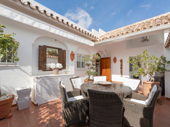 We present this special & classic property in the well known development of Los Jarales. Nestled in the heart of Aloha with views towards the Aloha golf course and across the valley. The spacious entrance takes you to the property through the large patio where you can enjoy the morning sun and its a perfect place for the warm summer evenings. The spacious living room has direct access to the west facing terrace with beautiful open views, here there is also the large kitchen and laundry area , the spacious master suite and a guest toilet. On the lower floor you have 2 large ensuite bedrooms. The property comes with a private look up garage which is easy accesable from the house. The property has been well maintained by the current owners and is ready to move into. Please note that the m2 built are bigger than advertised. A true gem in a popular urbanisation.