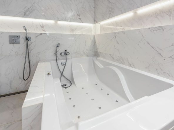 The master suite has a specially designed walk in wardrobe and en-suite bathroom has a stunning two-person bath, all the bathrooms are fitted with Villeroy and Bosh taps and sinks. There are a further two double bedrooms also en-suite.