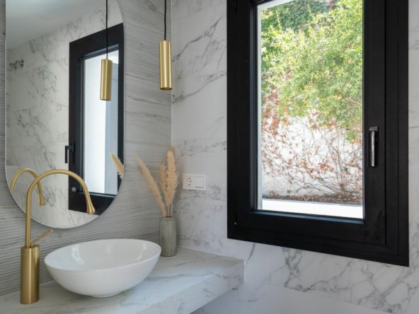 With its southwest orientation, the villa is bathed in natural light throughout the day, creating a warm and inviting atmosphere both indoors and out. From the partially elevated position, you can enjoy serene and partial views of the sea while still being just a short stroll from a wide selection of restaurants, cafés, and supermarkets.