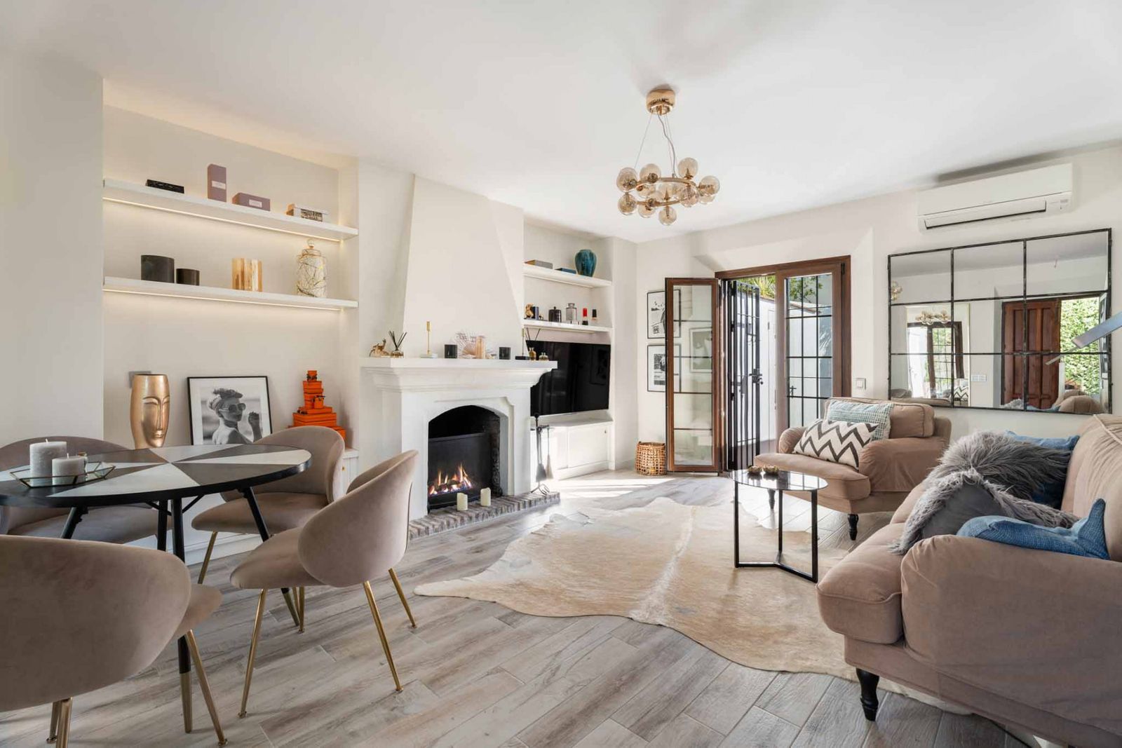 The home has been thoughtfully updated, blending Andalusian charm with modern comfort. The ground floor offers an open-plan living and dining area with a fireplace and direct access to a private terrace framed by Mediterranean greenery. A refurbished kitchen with contemporary finishes connects seamlessly to the living space, creating a functional and inviting layout.