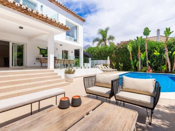 This elegant 4 bedroom private villa is located in the gated urbanisation of Marbella Country Club in Nueva Andalucia. It offers a blend of traditional Andalusian and modern style due to renovating over the past 10 years. Boasting a 11 meter private pool, fully equipped outdoor kitchen, independent wine cellar, automated toilets, and zoned floor heating and air conditioning, this property ticks all the boxes for a family looking for their new home.