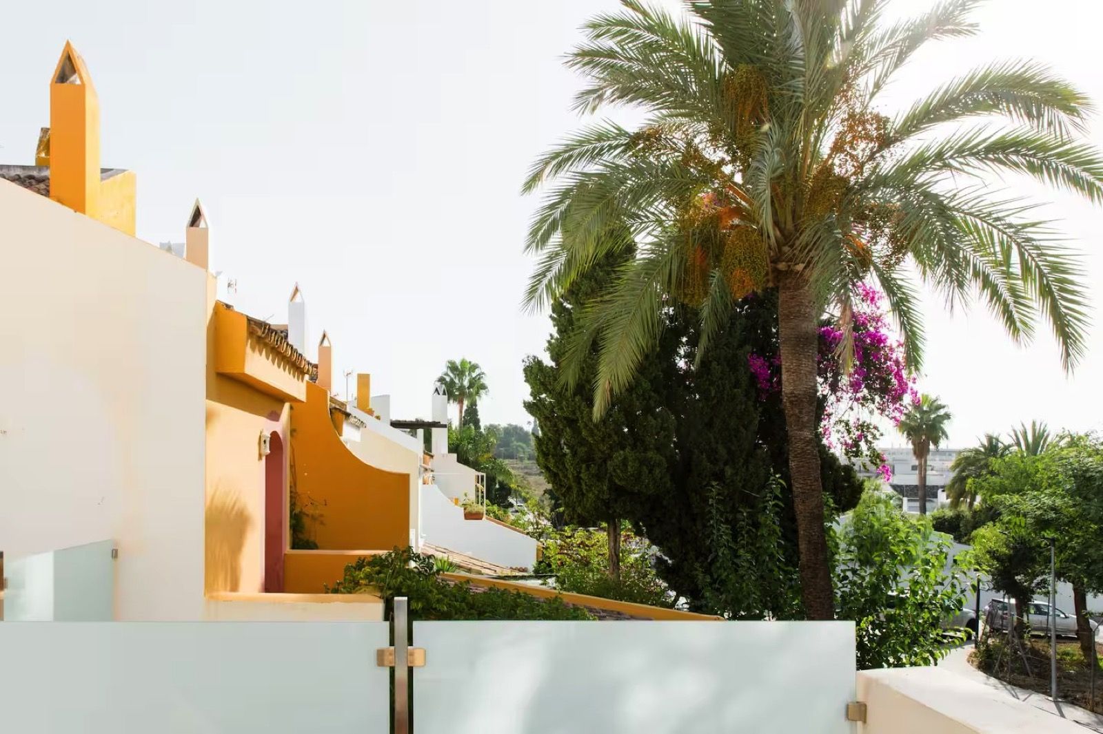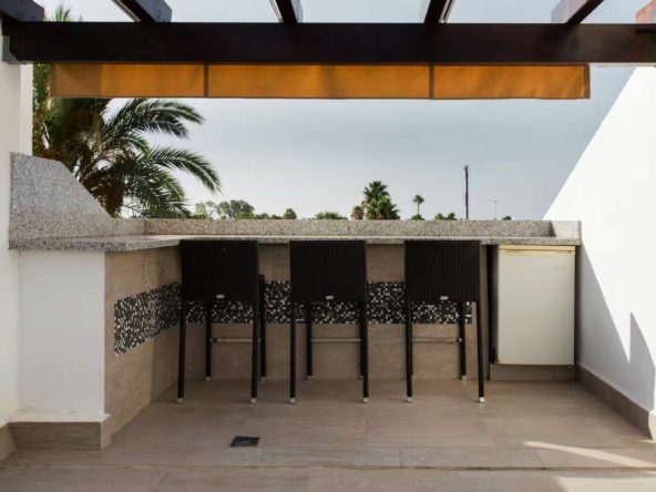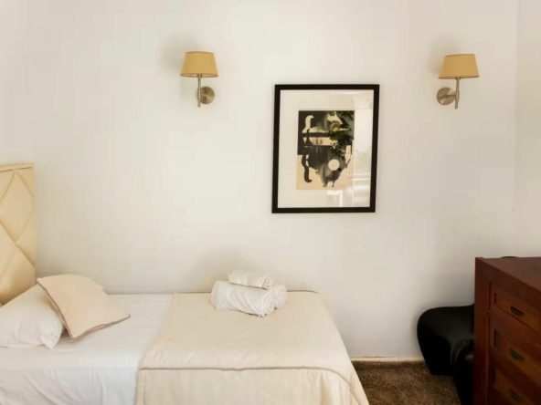 Spanning three levels across 166 m² of built space, this south-facing gem boasts abundant natural light and a versatile layout perfect for large families or holiday rentals. The ground floor features a welcoming living-dining area with a cosy fireplace and parquet flooring, a fully equipped kitchen, and access to a private terrace and balcony for al fresco enjoyment. Upstairs, five generous bedrooms with fitted wardrobes provide ample space, complemented by three modern bathrooms. With air conditioning throughout and a proven track record as a high-yield investment—generating approximately €50,000 for the summer months alone through short-term lets—this property promises excellent returns in Nueva Andalucía's booming rental scene, where 5-bedroom townhouses can fetch €25,000+ monthly in peak season.