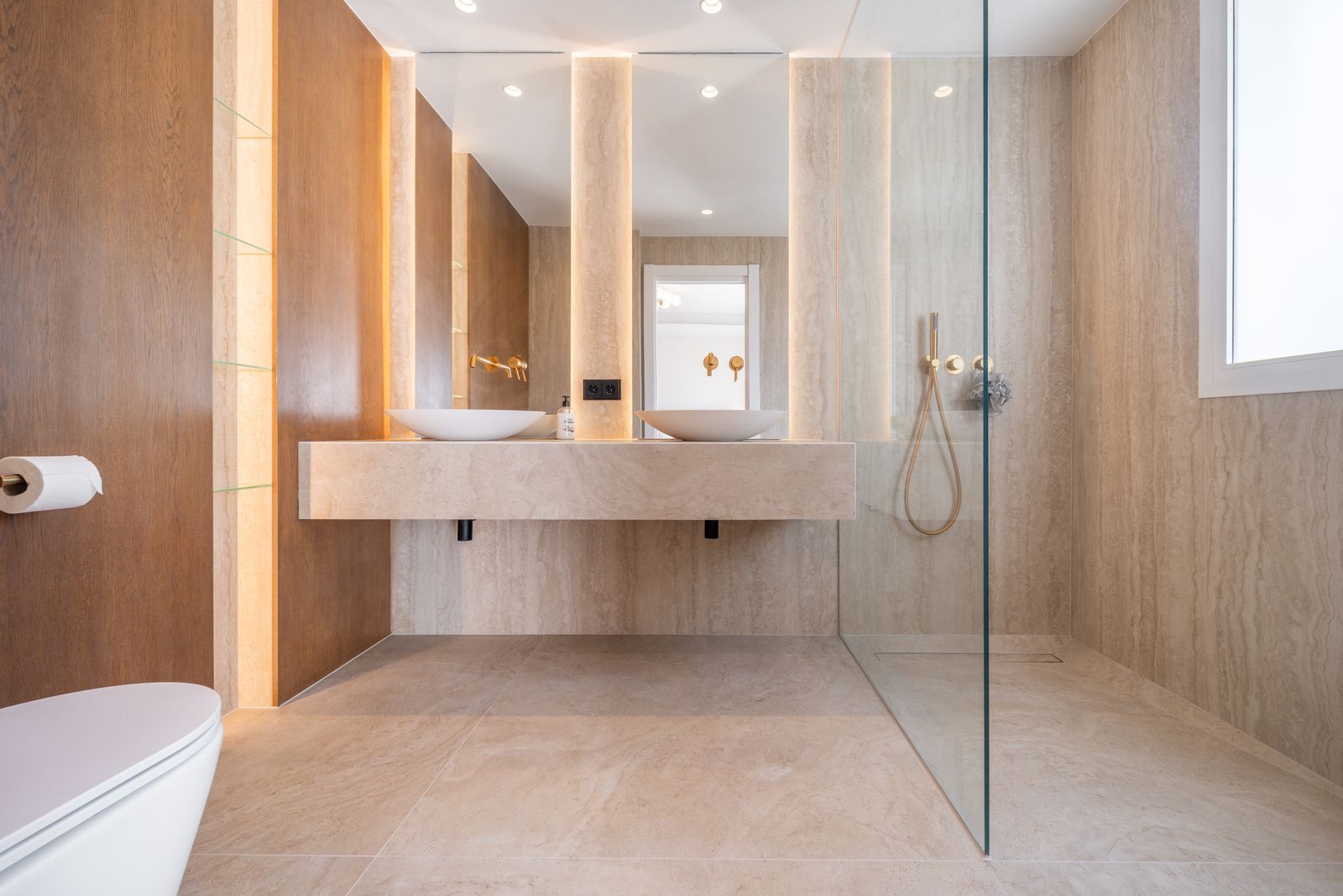 As you step upstairs into the property, you are met with a large landing comprised of the beautiful oak herringbone with bespoke bannister, to the left you will find the guest bedroom which is a very well proportioned room with custom backlit glass wardrobes featuring a linen interior to match the bedroom wallpaper. This bedroom has its own ensuite bathroom that features floor to ceiling travertine tiling, backlit niches with floating glass shelving, underfloor heating and a matching vanity unity with a full height bespoke backlit mirror.