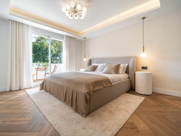 Leading into the master bedroom of the home, you have a vast master suite with a quad fitted wardrobe to match the other bedroom, it has been carefully designed to allow enough storage for a variety of clothing, including a dedicated bag display to the right hand side. This bedroom benefits from a private terrace where you can sit and look across Las Brisas golf course. The master ensuite is designed in the same high end way as the other but with added space, more solid oak panels and natural light that is let in through from the rear of the property. It has also been designed to include a separate his and hers sink upon the vanity unit.
