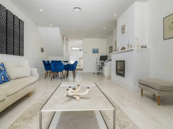 Spanning two floors, the townhouse features a first-floor living area complete with a cozy fireplace and windows that lead to a terrace and a well-maintained private garden, tended to by community gardeners. The kitchen is seamlessly integrated into the living space, and there's a convenient guest toilet for added comfort.