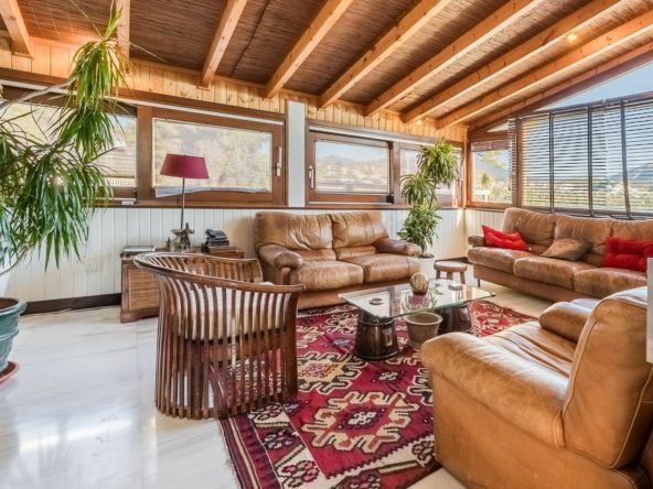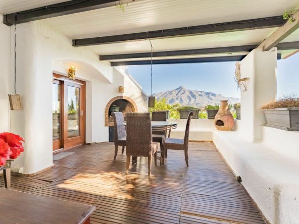 – Second level: A large main lounge opening onto a spacious covered terrace with seating and barbecue area, enjoying panoramic views of the garden, pool, mountains, and Marbella cityscape.