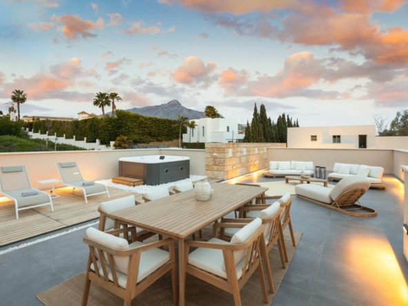 Ascending to the rooftop solarium, you’ll discover a true lifestyle haven. Complete with a jacuzzi and lounge area, this space offers breathtaking views of La Concha mountain perfect for sunset cocktails and relaxed evenings under the Mediterranean sky.