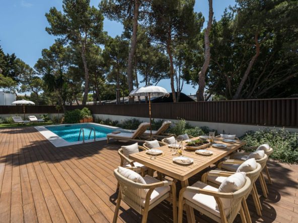 The villa features a large terrace that connects seamlessly with the private pool, creating an inviting space for outdoor lounging, dining, or hosting, as well as a roof terrace and a garden. The orientation ensures abundant natural light and serene views of the pool area, while the open-plan layout of the main living spaces enhances the flow between indoors and outdoors.