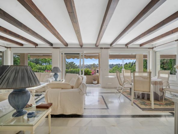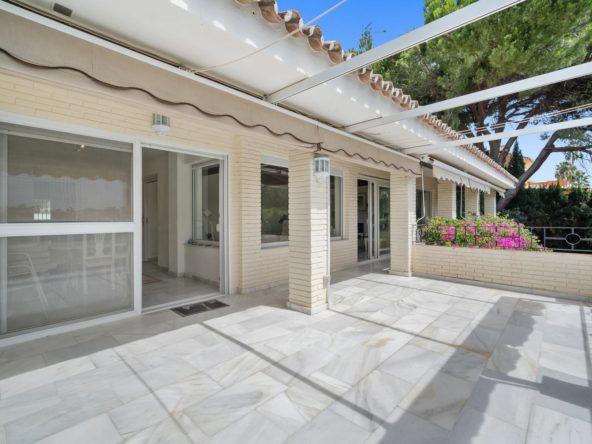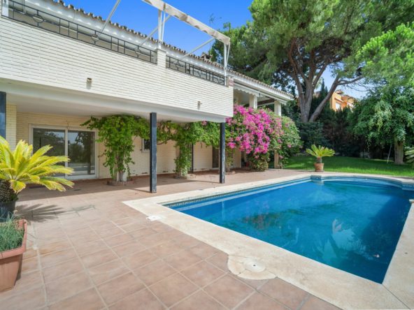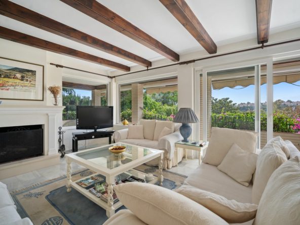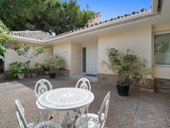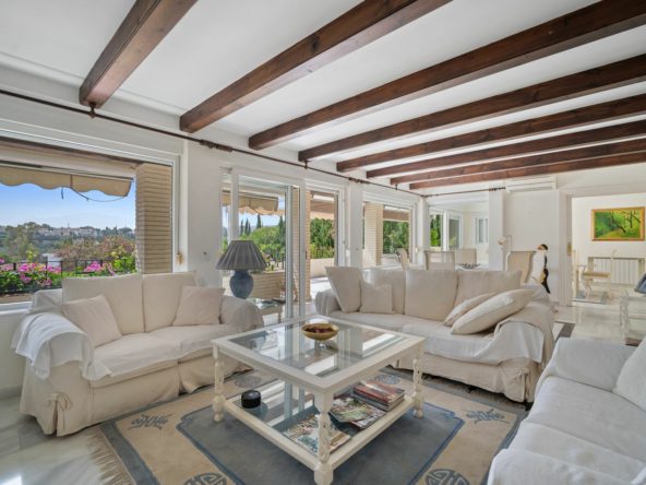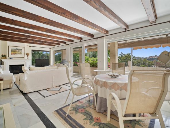 This villa is nestled in an elevated position within the urbanisation of Guadalmina Alta, a beautiful and well-established urbanisation known for its quality living. This villa boasts stunning panoramic views due to its well-designed elevated position on a sizeable plot. The entrance to the house is graced by a picturesque patio, adding to its charm. On the main floor, you will find a beamed, generously-sized living room with cozy fireplace and a dining room offering access to a delightful terrace. Additionally, this floor accommodates two bedrooms, a bathroom and guest toilet.