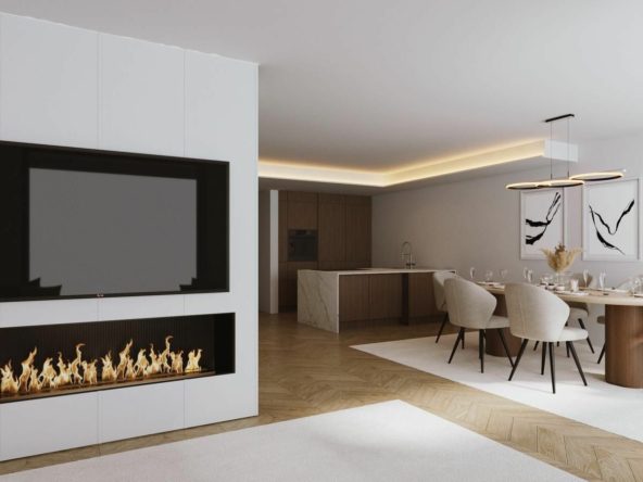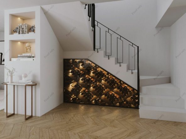 Inside, you're welcomed into a warm living room with an open-plan kitchen, the social heart of the home. The clever layout, natural light, and modern finishes create a sense of luxury and tranquility. The bio-ethanol fireplace creates ambiance on cool evenings, while the beautifully integrated wine cellar under the stairs is a real eye-catcher for wine lovers and anyone who enjoys entertaining in style.