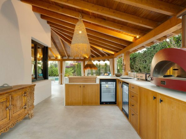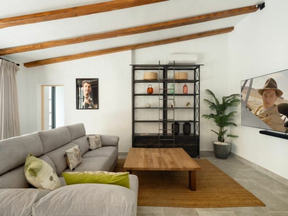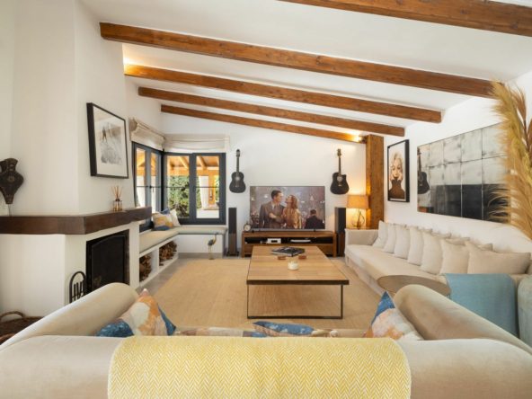 Inside, the villa offers a bright and spacious living room with fireplace, a formal dining area, and a modern, fully fitted kitchen. The connected guest apartment—with its own entrance and private kitchen—is ideal for teenagers, extended family, or guests seeking independence while remaining part of the main residence.
