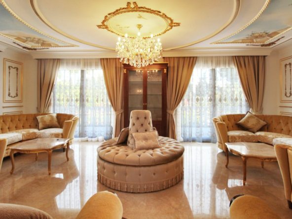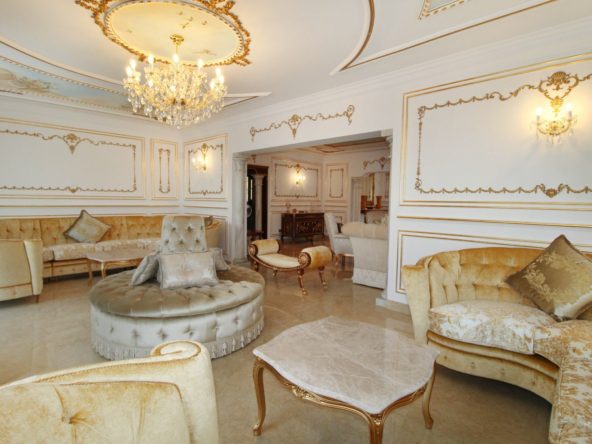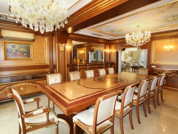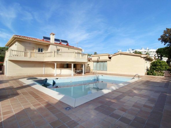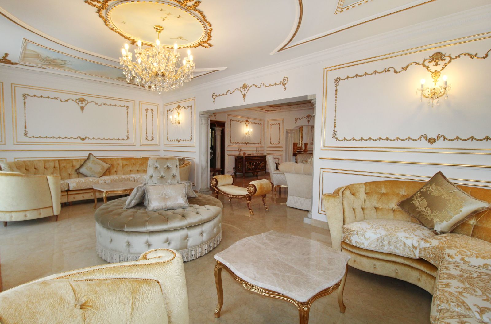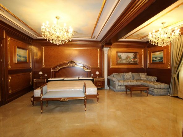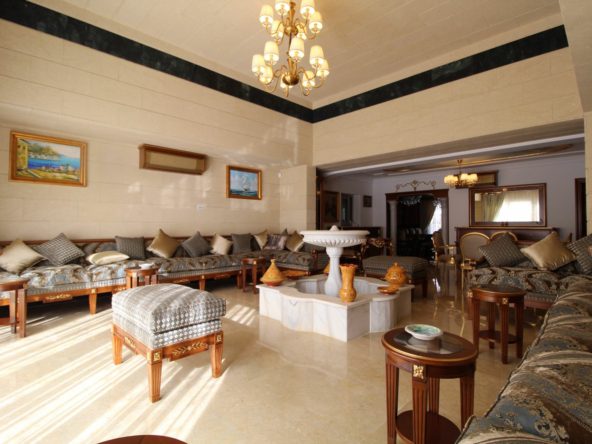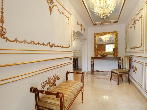A totally reformed substantial palatial Arabian styled villa which offers eight-bedroom suites which incorporate 2 self-contained suites. The villa has four-meter height impressive double entrance gates and an 81-meter long driveway with parking for numerous cars and is all situated on a huge 4,100 m2 flat plot in Guadalmina Baja and only 322 meters walking distance to a lovely beach and Dantonelas Beach Club. The villa offers good sized rooms throughout which includes the following accommodation, a formal lounge with feature fireplace and concealed plasma TV which is semi open plan to a further large sitting room which has views over the landscaped front garden, from the formal lounge you enter a fabulous formal dining room with table and sitting for 12 people which has very ornate wood and gold paneling to the walls and ceiling. A further traditional Arabic majlis formal lounge with fitted seating and feature central marble fountain with direct access to the large covered rear terrace and overlooking the impressive swimming pool, outside bar, BBQ and sitting areas. Brand new fully fitted L-shaped modern kitchen. There is a generously sized master bedroom suite with a walk-in fully fitted dressing area and fully tiled master ensuite-bathroom. Also, on the ground floor level in the main villa are three further bedroom suites and a maid’s double bedroom/ laundry room off the kitchen. Outside you have one of the self contained apartments which is adjacent to the double garage. Above the garaging area is a very large two double bedroom formal guests apartment which has a fully fitted kitchen with the open plan lounge/dining room and large private upper terrace overlooking the private secluded rear garden and swimming pool area. The villa offers very ornate hand painted wall and ceiling panels in all the main living areas and exceptional handmade bespoke Italian designer furniture throughout. The villa is a one of a kind with stone walling on the exterior and in the traditional Majlis lounge. One has to view to fully appreciate all the fine internal features of this very spacious family home.