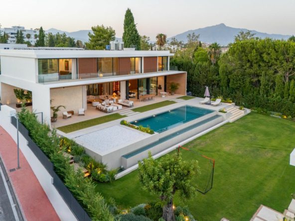 This contemporary six-bedroom villa is located in the prestigious Guadalmina Alta area of Marbella. Blending striking modern architecture with practical living, it features clean lines, extensive glazing, landscaped gardens, and exceptional curb appeal.
