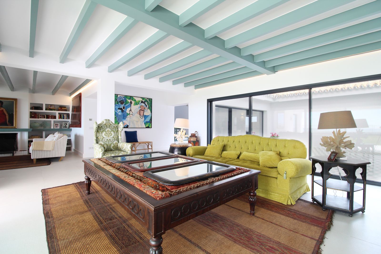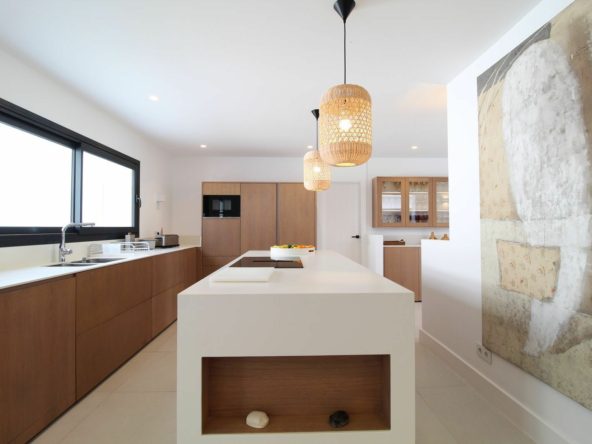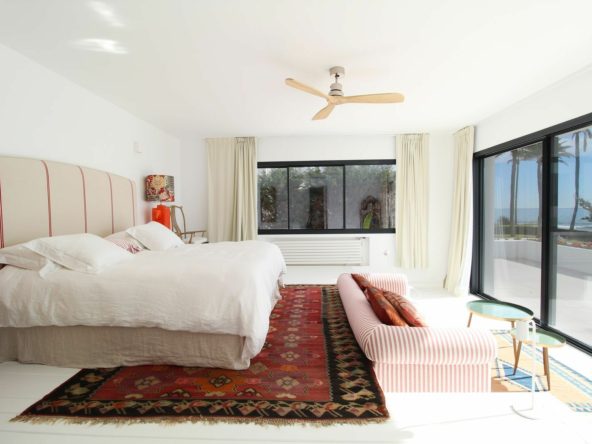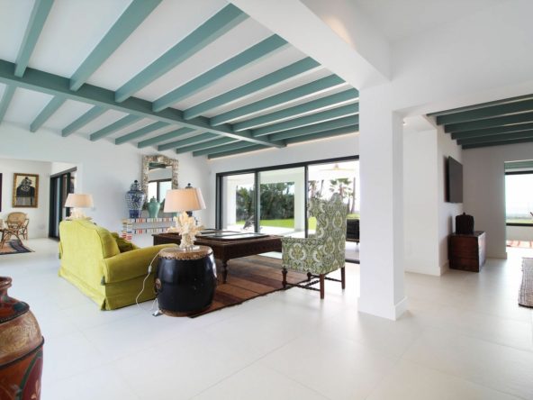 Exceptional villa situated front line beach in the highly desirable and gated community of Casasola, Guadalmina Baja. This recently renovated south-facing property enjoys breathtaking panoramic Mediterranean views with both Africa and Gibraltar in the distance. The property sits on a 2,300m2 plot and is both contemporary and Ibizan in style. The house has a sensible distribution, constructed around two central courtyards that allow light to flow throughout the property. The living room is divided into two separate areas with a cosy sitting room with a fireplace off the main section. This then leads to the dining area that has comfortable seating for at least 10 guests. Both the living and dining areas access the huge covered terrace which in turn leads out to the expansive gardens and pool area. The stunning “L” shaped kitchen has been well thought through and includes Siemens appliances. There is also a separate laundry room off the kitchen. The ground level of the property has six bedrooms suites, two of which have direct access to the gardens and pool area. Furthermore, there are two staff bedrooms at the rear of the property. The upper level consists of the master suite, twin bathrooms, a host of wardrobe space, plus a solarium from which you can enjoy the views and the sound of the waves crashing on the shore. The community has 24h security guards and is located just a short drive from San Pedro and Puerto Banus.