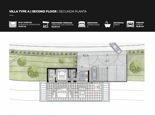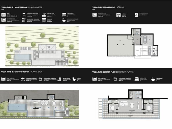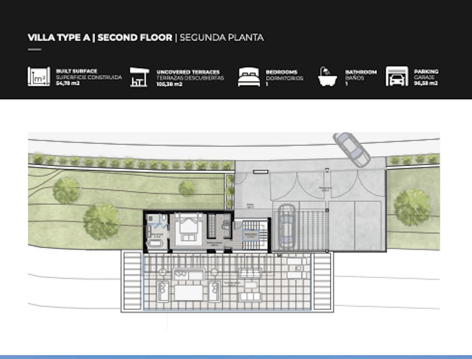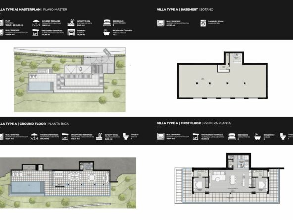 The original design offers a total build size of 440m2, of which covered terraces are 164m2, uncovered terraces 310m2, a pool of 51m2, a garage of 45m2 iand nterior built surface. of 258m2