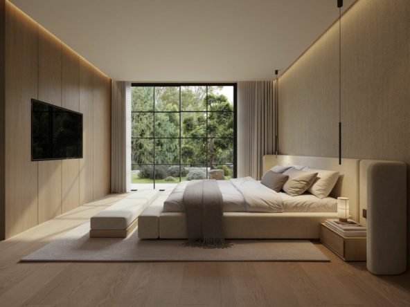 The main level is thoughtfully designed to separate the day and night areas. The night area includes a luxurious primary bedroom with en-suite bathroom and walk-in wardrobe, as well as a bright patio that brings natural light into the hallway leading to three guest bedrooms, each with its own private bathroom. The day area comprises a spacious living-dining room, a modern kitchen, a guest toilet, and a laundry room. Extending the living space outdoors are a lounge porch and a dining porch, complemented by an exterior guest toilet, an open terrace, a swimming pool with sunbed area, and two landscaped gardens that create a serene atmosphere for outdoor living.