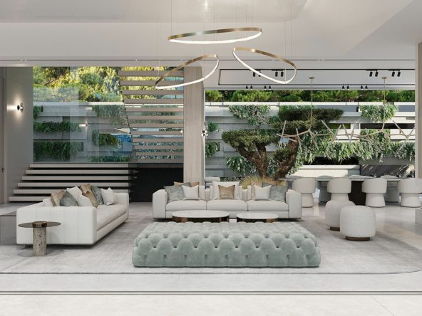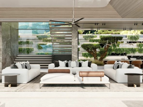 The inspiration for the design was the plot's breathtaking location in a valley flanked by steep hills on either side, with uninterrupted views of the Mediterranean sea. The villa is built into the hill side, as if it almost becomes part of the environment, rather than just sitting on top of it. All the windows disappear into the walls, whereby nature is brought into the living spaces using water features, living walls, and natural materials. The design is inspired by the natural vegetation and used colors and materials that perfectly matched the decor of the villa. The valley is home to a wealth of naturally occurring dark stone, which has been incorporated into many of the wall finishes. This is a home that is truly integrated with its natural surroundings—it's absolutely amazing!