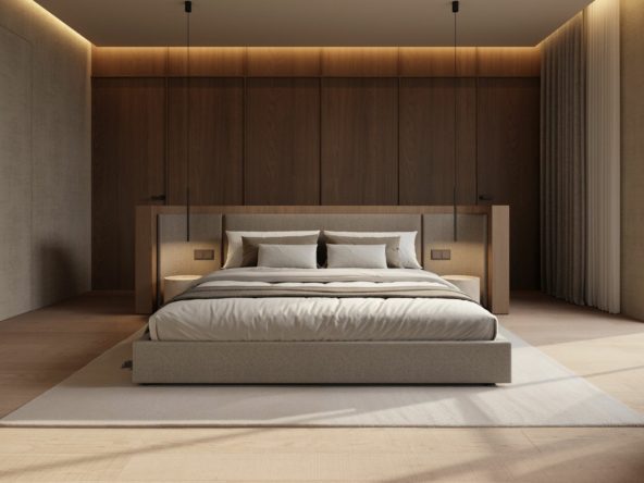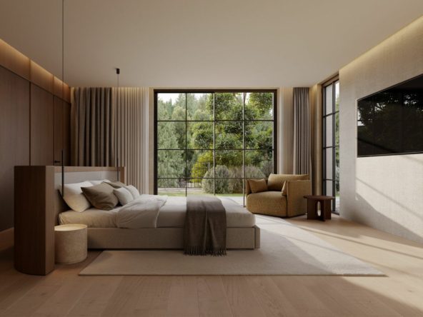 The lower-ground/ground level is cleverly divided into two functional areas. The first, corresponding to the basement—defined by its position more than 1.5 m below the original terrain— The second area, considered the ground floor due to its exposure above the terrain on two sides, offers a spacious and comfortable living layout. It includes a pantry, a bedroom with en-suite bathroom, an additional bedroom with en-suite bathroom and walk-in wardrobe, a distributor, a reception area, a kitchen, a generous living-dining room, a guest toilet, and a covered porch extending from the living room. The remainder of this level comprises an open terrace, landscaped garden, and a swimming pool with sunbed area, creating a perfect setting for outdoor living and relaxation.