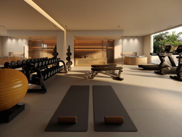 Descending from this access level brings us to the upper floor, which includes the vertical communication core, a distributor, a guest toilet, a technical room, an electrical room, and a gym with sauna that opens onto a pergola-shaded terrace, creating a private wellness area with ample natural light and comfort.