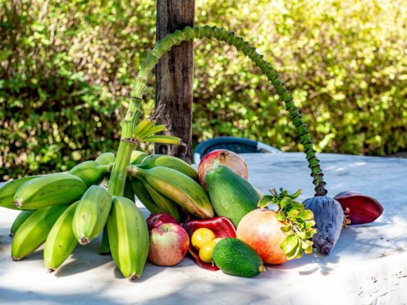 The ancient holes & greens have been turned into a unique tropical food forest through regenerative agriculture where over 120 different species of fruit and vegetables