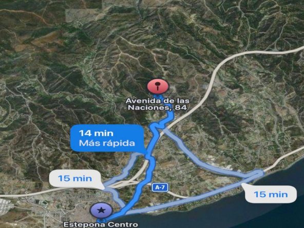 Access is fully paved and convenient, in a well-established residential area with several villas nearby. The property is only an 8-minute drive from the beach and the ALDI supermarket, 15 minutes from Estepona town center, and 25 minutes from Marbella. It is also located next to the Estepona Tennis Club and close to the exclusive Laguna Village and Beso Beach, two of the best beach clubs and restaurants in the area.